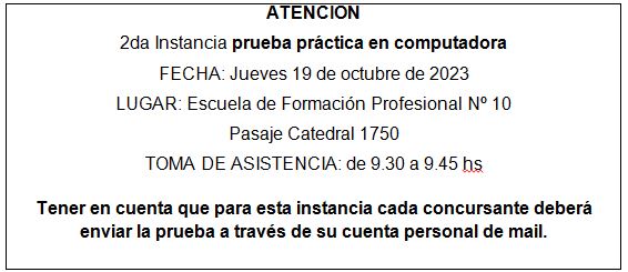 24/10/2023 - 3era instancia Prueba Oral, se llevará a cabo el día Miércoles 1 de noviembre en Escuela de Formación Profesional Nº10 (Pasaje Catedral 1750). Toma de asistencia 8:10 a 8:30 hs.