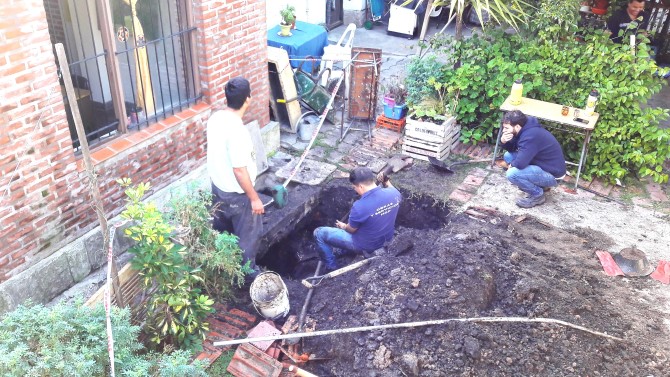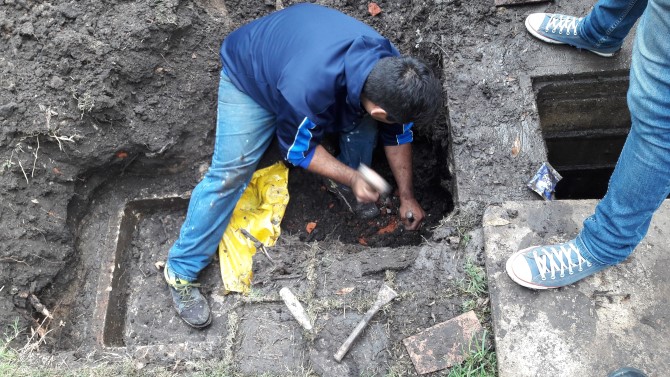En esta segunda etapa, dada la magnitud del tramo del desagüe, agentes del Departamento de Servicios Generales del EMSUR trabajan en la construcción de una cámara de inspección para derivar el caño y que pueda evacuar adecuadamente hacia el cordón de vereda