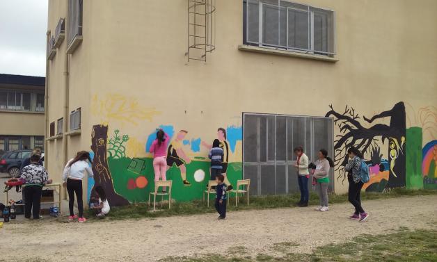 La muralista propuso una lluvia de ideas para ir decidiendo entre todos los participantes cuál sería el boceto que se plasmaría a la pared, así comenzó este mural donde niños, niñas, adolescentes y adultos comparten un momento de creatividad, juego, trabajo en equipo y sobretodo convivencia pacífica.