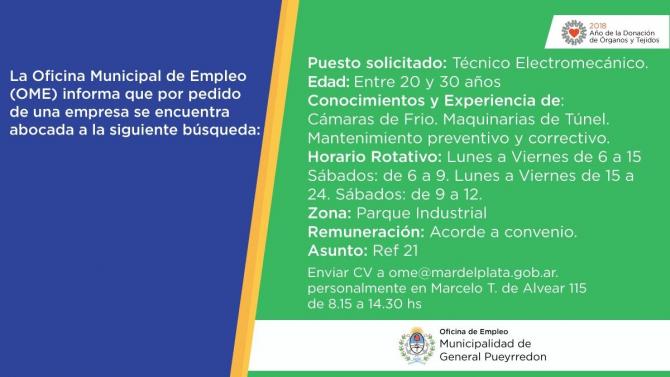La Oficina Municipal de Empleo informa que por pedido de una empresa se encuentra abocada a la búsqueda de:
