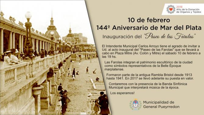 Con motivo de celebrarse el 144º Aniversario de la fundación de Mar del Plata, el intendente Carlos Fernando Arroyoinaugurará el “Paseo de las Farolas” en la Plaza Mitre este sábado a las 19.