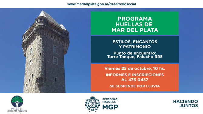 La Dirección de Adultos Mayores de la Municipalidad de General Pueyrredo los invita a una nueva  edición del Programa Huellas de Mar del Plata. El mismo está destinado a personas mayores de 50 años y consiste en visitas por los diferentes barrios de la ciudad cuyo objetivo es rescatar la impronta de cada uno de ellos, sus mitos y leyendas urbanas, las historias de vida de los vecinos como así también,  el valor del patrimonio arquitectónico.