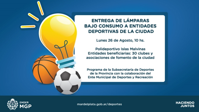 Con el objetivo de acrecentar el acompañamiento a las instituciones deportivas, la Provincia, a través de la Subsecretaría de Deportes de la Provincia y con la colaboración del Municipio, a través del EMDER, se entregarán lámparas de bajo consumo a entidades deportivas de la ciudad.