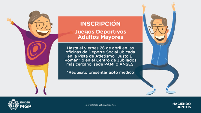 Hasta el viernes 26 de abril en las oficinas de Deporte Social ubicada en la Pista de Atletismo "Justo E. Román" o en el Centro de Jubilados más cercano, sede PAMI o ANSES.
