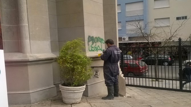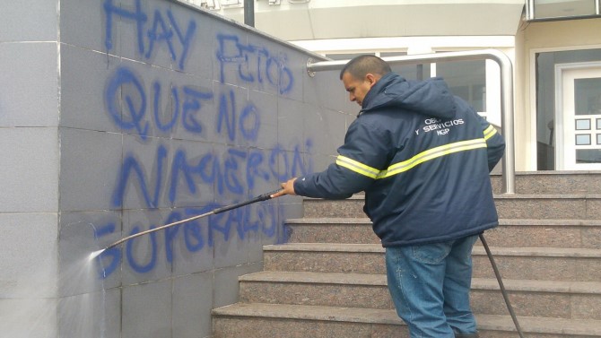 Durante toda la jornada de hoy agentes municipales del Ente de Servicios Urbanos, a cargo de Marcelo Artime, procedieron a hidrolavar y limpiar la fachada de comercios, edificios de departamentos y organismos públicos que fueron escritos con graffities tras el paso de la manifestación de mujeres el pasado domingo.