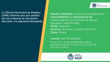 La Oficina Municipal de Empleo informa que por pedido de una empresa se encuentra abocada a la siguiente búsqueda: