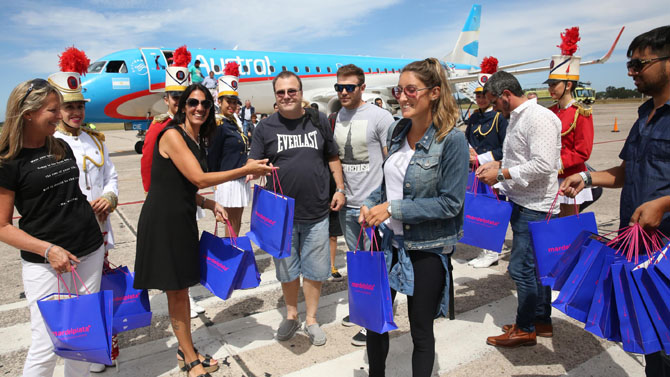 El avión llegó con aproximadamente 70 pasajeros que fueron recibidos por la Guardia del Mar y autoridades municipales, que les entregaron obsequios y material promocional de la ciudad.