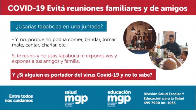 Te recordamos que las reuniones sociales no están permitidas ¿Podrías usar tapaboca en una juntada? No, porque no podrías comer, brindar, tomar mate, o charlar. Si te reunís y no usas tapaboca te exponés y exponés al resto. Además, alguien podría ser portador del virus y no saberlo. Sigamos siendo responsables. Seguir cuidándote hoy es la única vacuna.